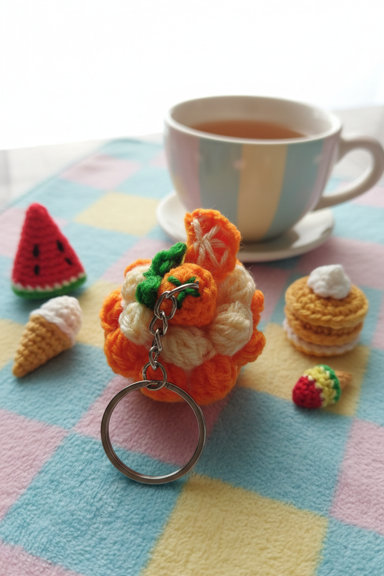 This handmade cake keychain is lightweight, durable, and perfect for everyday use. Attach this crochet food keychain to your car keys, house keys, purse, backpack, or tote bag as a cute crochet bag charm. Whether you love citrus-themed accessories or unique handmade items, this amigurumi cake charm adds a playful pop of color to any look.