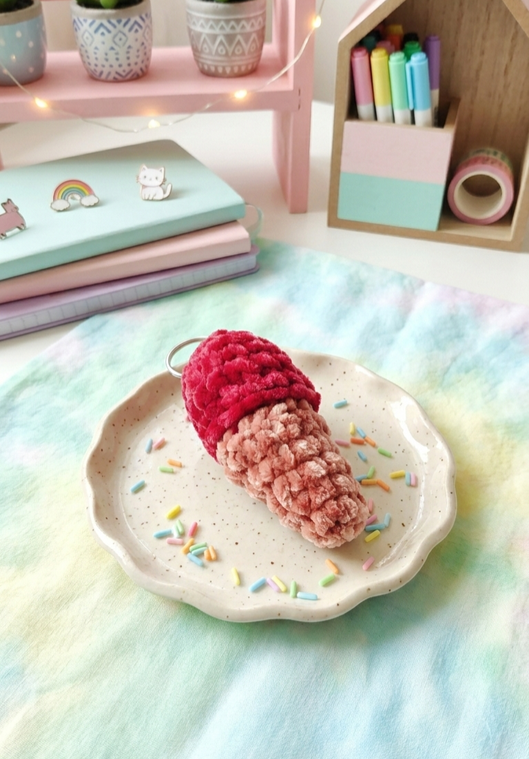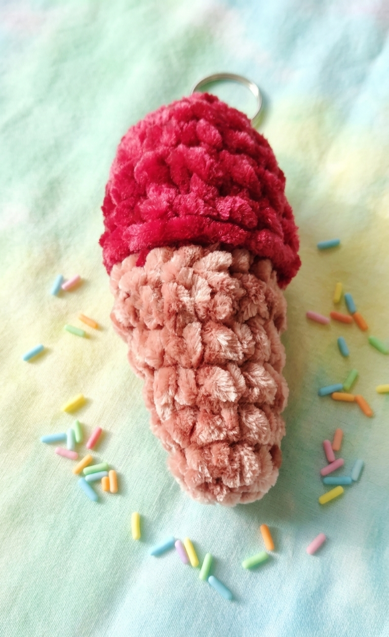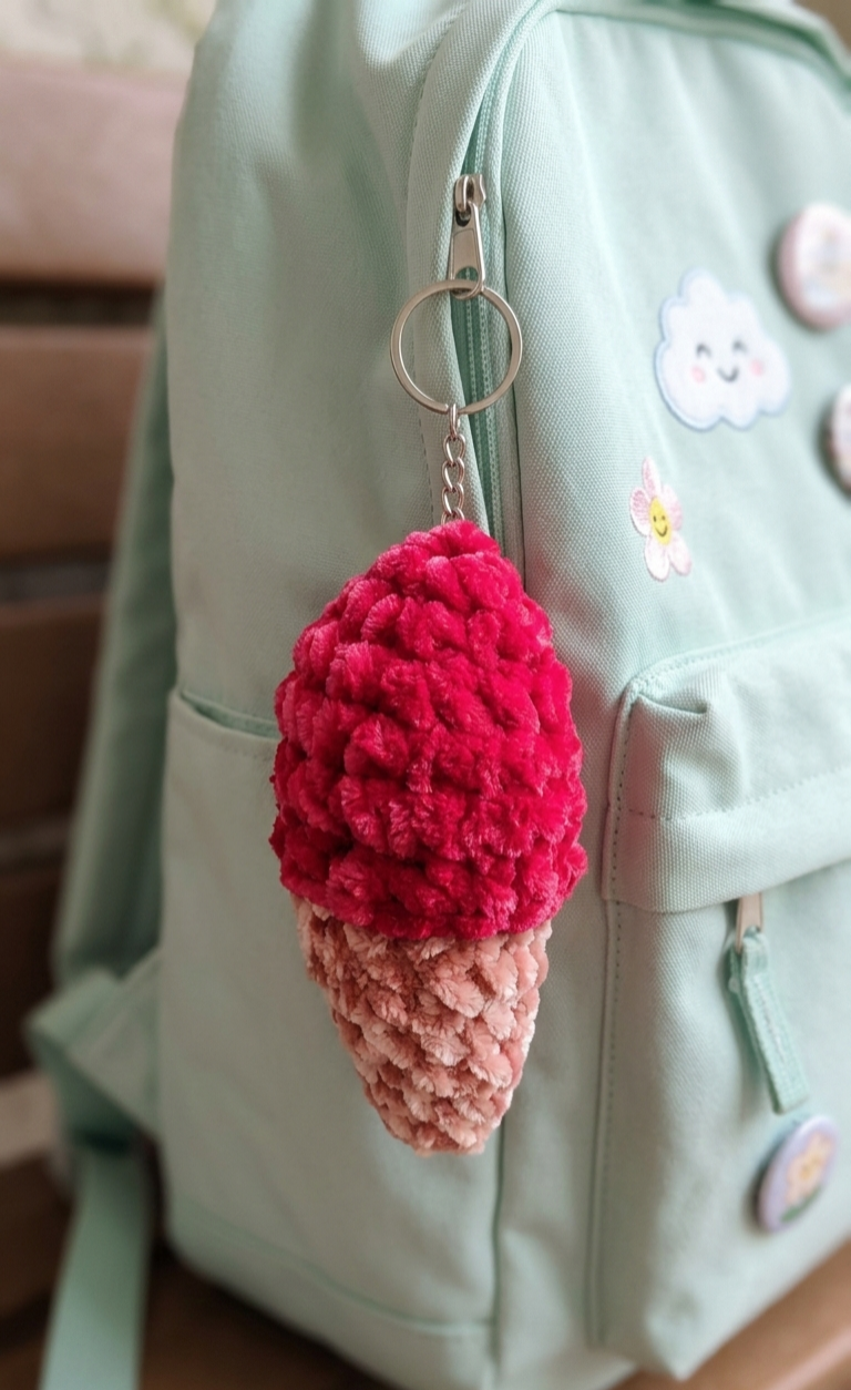 Perfect for those who love handmade crochet accessories, velvet yarn amigurumi, cute keychains, and unique handmade gifts, this crochet velvet ice cream keychain is a charming and playful addition to any collection.