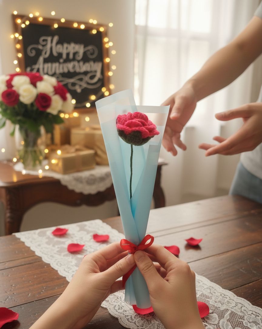 This handmade crochet rose flower bouquet features beautifully crafted roses made from high-quality yarn. A long-lasting and eco-friendly alternative to real flowers, this crochet flower bouquet is ideal for birthdays, weddings, anniversaries, home décor, and special occasions. Perfect as a unique handmade gift that lasts forever.