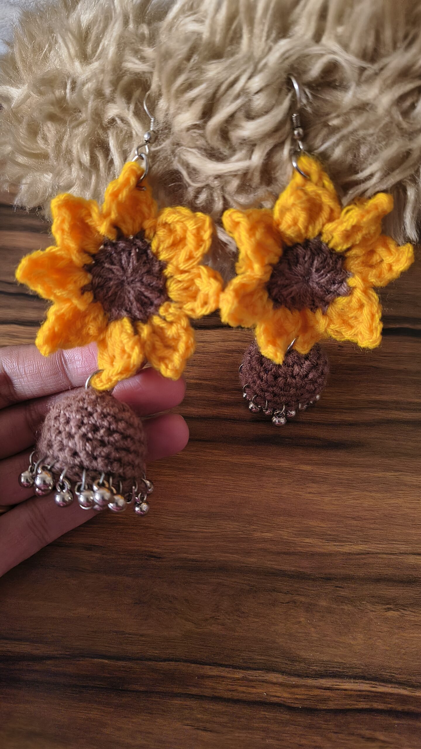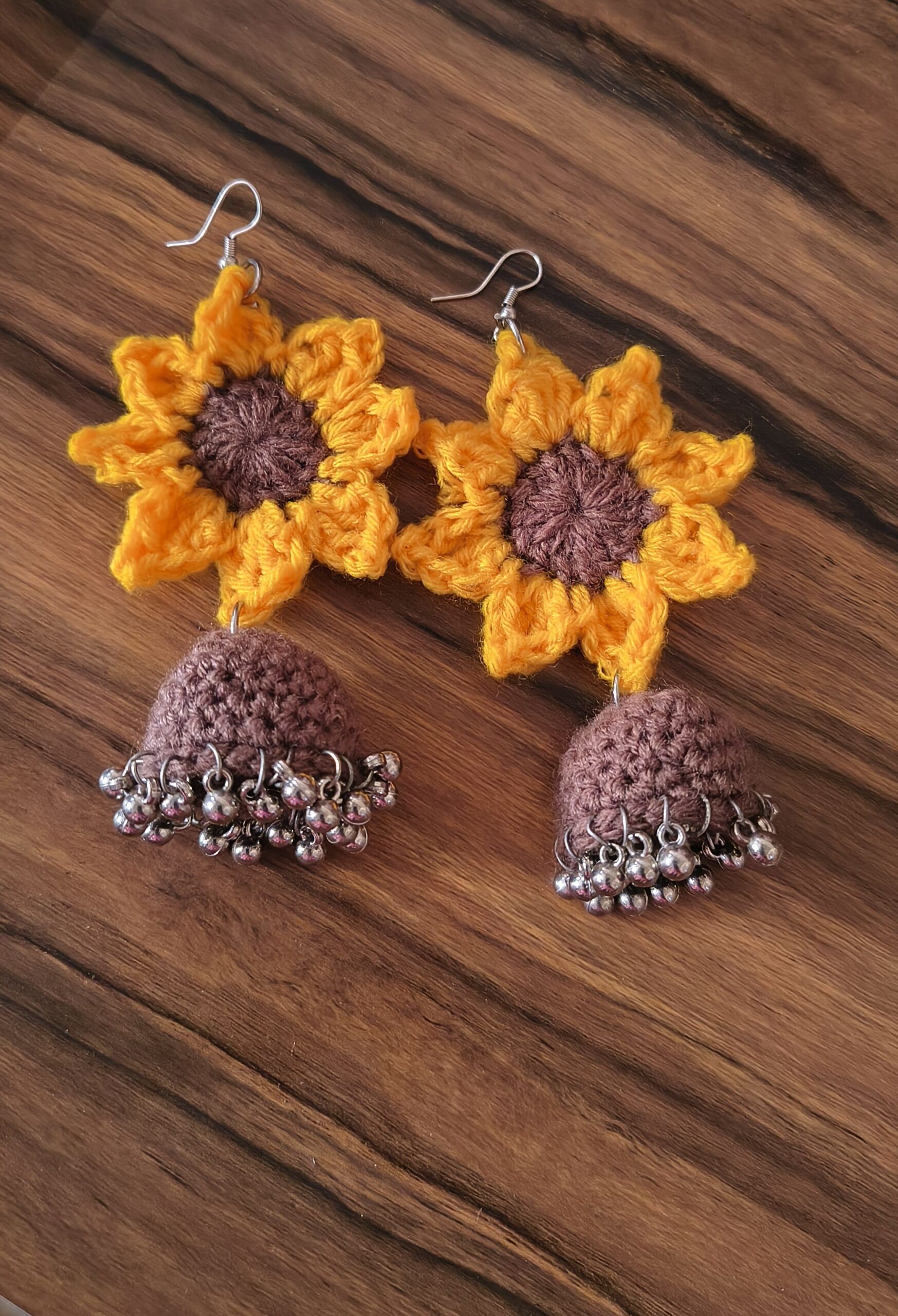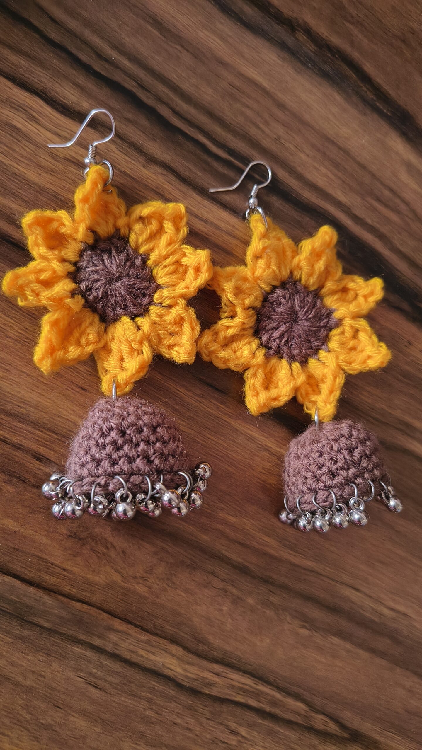 Add a touch of handcrafted charm to your look with our Crochet Sunflower Jhumka Earrings, beautifully designed for boho fashion lovers. These lightweight, handmade earrings feature vibrant crochet sunflowers paired with traditional jhumka detailing, making them perfect for festive wear, casual outfits, and gifting. Elevate your accessory collection with these handmade crochet earrings, sunflower jhumkas, and boho ethnic jewelry—a unique blend of elegance and artistry. Ideal for women who love trendy handmade accessories, boho earrings, and crochet jewelry.