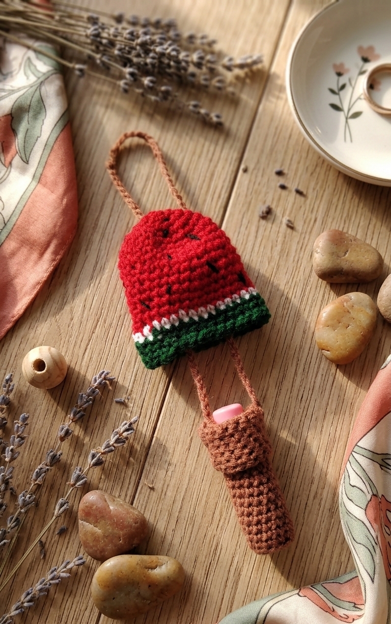 This crochet watermelon lip balm cover bag charm makes a thoughtful gift for birthdays, party favors, stocking stuffers, or just a fun treat for yourself. Add a pop of color and handmade charm to your daily routine today!