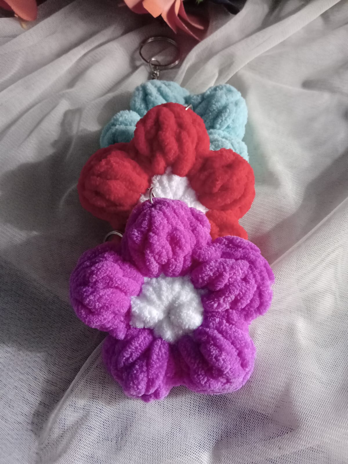Add a touch of whimsy to your accessories with our handmade flower crochet keychains . Each keychain is meticulously crafted with love and care using high quality yarn , ensuring durability and style . these vibrant flower crochet bag charms come in a variety of hues , making them the perfect accessory for bags , keys , or purses . our unique crochet flower keychains are ideal for birthday gift , anniversary gift , or casual use . color of these handcrafted floral keychains are – purple , red , skyblue . weight of these cute flower keychains – 10 gm each .