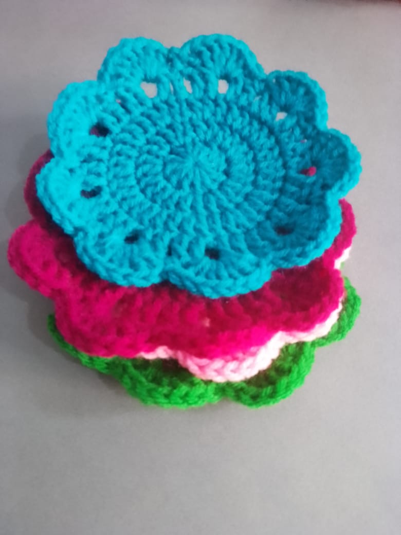 indulge in the charm of our handmade flower shape tea coaster sets of 4 , crafted with care and creativity ,each coaster embodies the vibrant hues and organic shape of a flower .the vibrant colors of these handmade crochet coasters adds a pop of brightness to any table setting , while the intricate design provide a touch of elegance .our cute tea coasters are made from soft yarn ,making them eco friendly and sustainable . they are also easy to clean and maintain .elevate your tea drinking experience with these eye catching table accessories. these round shape tea coasters adds a charm to your dinning table and you can also gift these crochet coasters to your close ones .height – 9.5 cm , width – 9.5 cm , baby pink , green ,blue ,dark pink in color , 40 grams in weight .shop now these Elegant tea coasters .