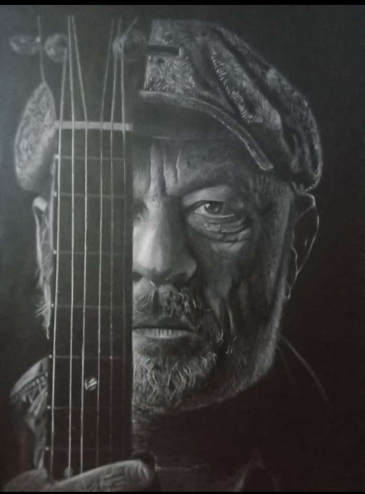Buy this stunning charcoal portrait of an old man carrying a guitar, featuring realistic detail and emotional depth. This black and white charcoal drawing captures the spirit of music and aging, perfect for lovers of framed charcoal art, musical-themed portraits, and fine art wall décor. Add timeless elegance to your home or gift this unique charcoal sketch today! This beautiful charcoal portrait will come with an elegant black frame.”