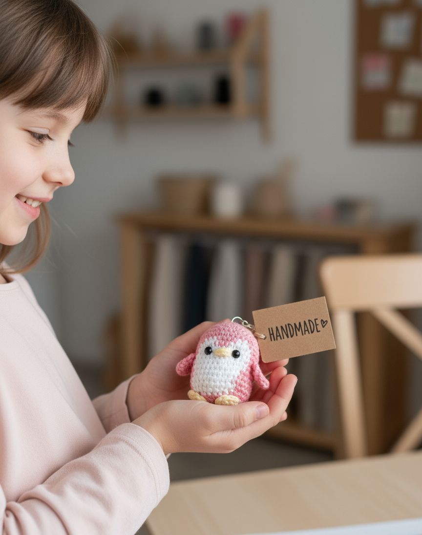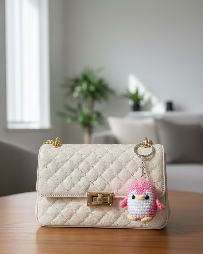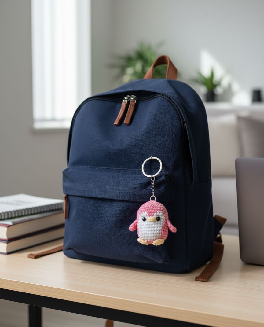 Meet our “Cute crochet pink and white penguin keychain – handmade amigurumi accessory perfect for backpacks, purses, or car keys. This kawaii penguin keychain is crafted from soft yarn, making it a lightweight and durable gift for penguin lovers, kids, teens, or crochet fans. Great for birthday gifts, stocking stuffers, or kawaii keychain collections. Add a touch of handmade charm to your everyday look with this adorable crochet animal keychain.”